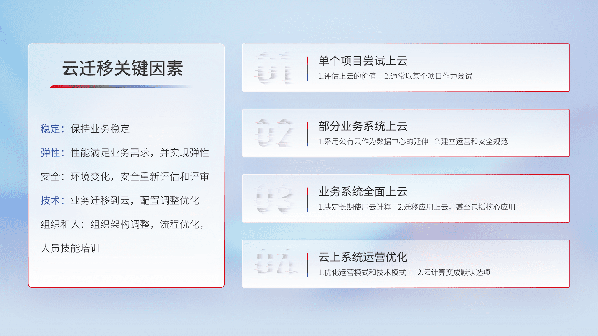 结合实际业务,,,从规划设计、、云平台选型、、、云原生改造、、、数据迁移、、集成交付,,,,迁移全过程为客户识别最佳上云路径,,,做好风险识别管理,,设计网络架构、、、身份权限、、安全审计合规、、、、操作审计、、、日志审计、、监控告警策略、、、、多站点容灾设计等,,,对云上基础设施进行整体规划,,,,提升IT治理水平,,,,以满足弹性、、、、高可用、、高性能的需求。。。。