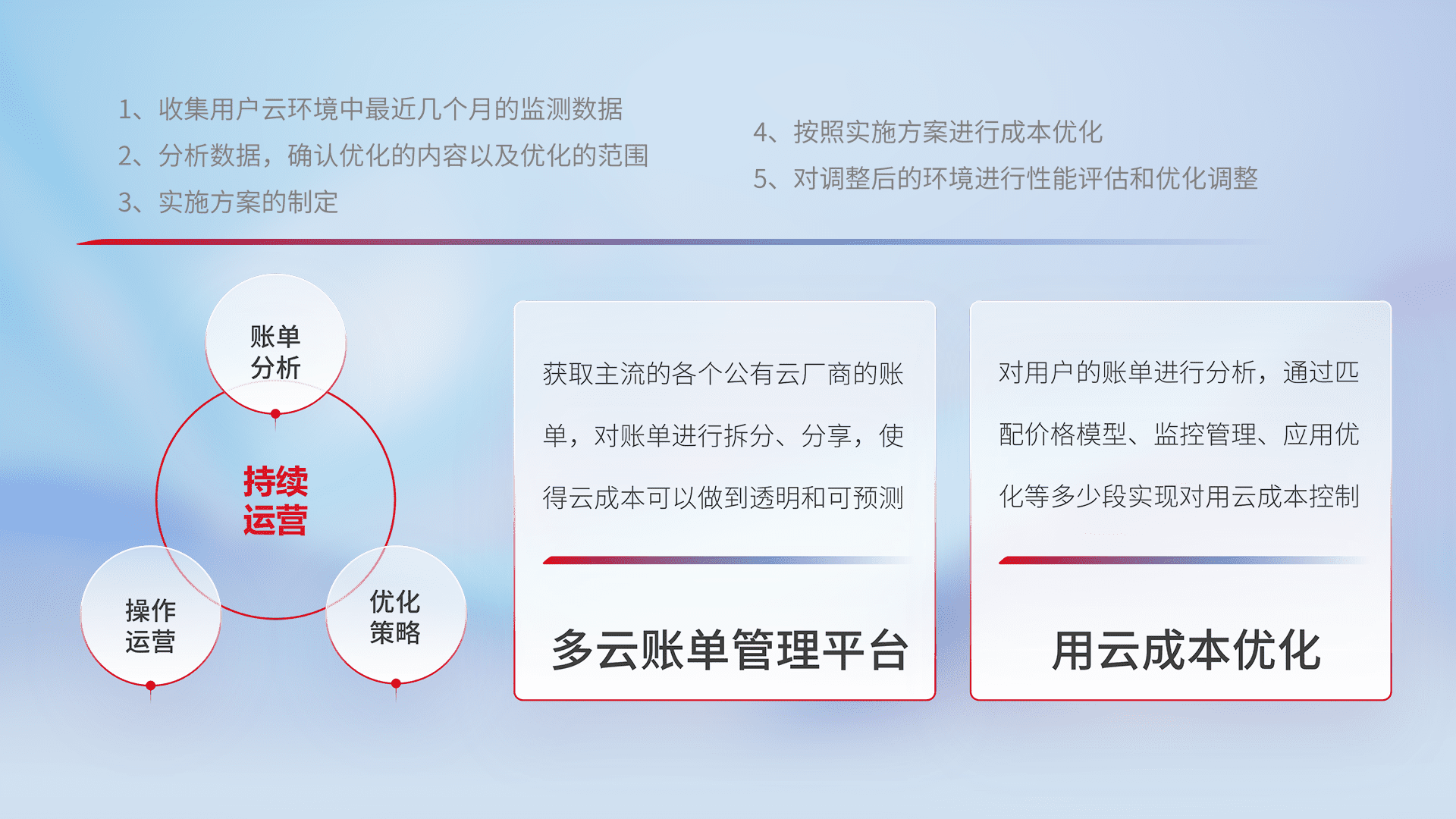 通过多云纳管,,,,以统一的资源数据模型把客户的云资源进行抽象和封装,,,进而实现对多云资源的统一操作,,,,保障云资源管理的可靠性、、稳定性与可用性。。量身定制化运维内容,,,,配置、、、开发运维、、、补丁管理、、、备份、、、监控、、、、认证和访问管理、、审计和日常巡检等,,,,保障在用云过程中的可靠度,,,稳定度以及高可用率。。。